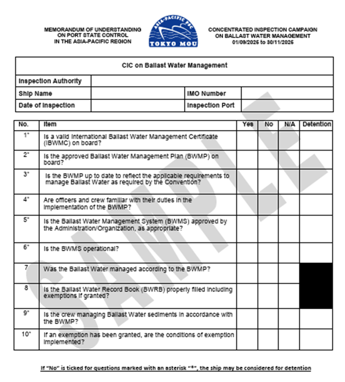 The inspection campaign will be held for three months, commencing from 1 September 2025 and ending 30 November 2025. A ship will be subject to only one inspection under this CIC during the period of the campaign. Port State Control Officers will use a pre-defined questionnaire to assess that the BWM requirements in the respective areas are met.